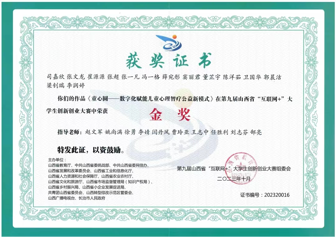 2023年 司嘉欣等同學作品《童心圓——數字化賦能兒童心理智療公益新模式》,在第九屆山西省“互聯網+”大學生創新創業大賽獲金獎,指導老師趙文軍等,由多部門主辦的大賽組委會頒獎 。