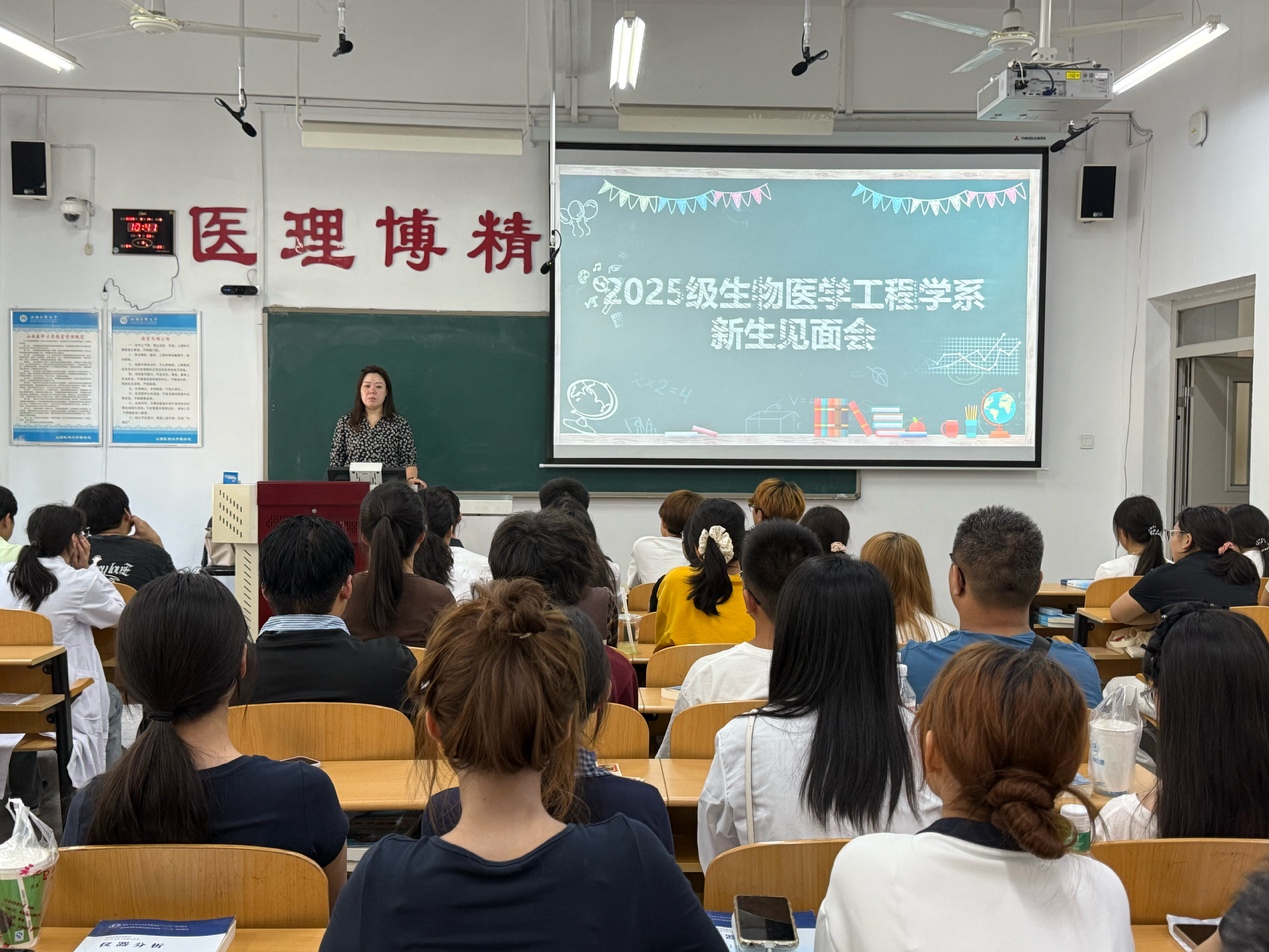 黨總支書記秦娜首先代表學系全體教師對新同學的到來表示最熱烈的歡迎。她深入闡釋了生物醫學工程這一交叉學科的獨特魅力與重大戰略意義。秦娜講到,“生物醫學工程是工程學、生物學和醫學的深度交融,是運用工程手段解決生命健康領域關鍵問題的前沿陣地。從高端醫學影像設備、可穿戴健康監護系統到納米靶向藥物載體、組織工程與人工器官,再到智慧醫療與AI輔助診斷,你們的舞臺廣闊無垠,你們的使命光榮艱巨。”為此她向新生們提出了三點期望:一是要志存高遠,心懷家國,做有理想的新時代青年。將個人發展的“小目標”融入國家發展的“大藍圖”,系好人生的“第一?圩印 。二是要勤學深思,勇于創新,做有本領的實干家。大學是知識的殿堂,更是能力鍛造的熔爐。在實驗實訓和科研創新中錘煉過硬本領,努力成為所在領域的拔尖創新人才。三是要修身立德,健全人格,做有擔當的奮斗者。希望新生們在大學里不僅收獲知識,更要學會與人相處、與社會接壤,培養堅韌不拔的意志、樂觀向上的心態和包容合作的團隊精神。