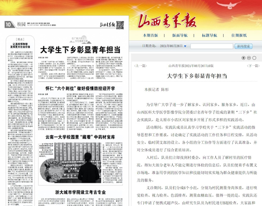 ?In order to guide the broad masses of students to further understand and serve their hometowns, recently, a summer "Sanxiaxiang" social practice team, composed of 17 young students from the Medical Imaging College of Shanxi Medical University, went to Liujiabao Township, Xiaodian District, Taiyuan City to carry out practical activities.During the activity, the members of the practice team con...