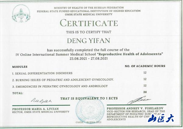(俄羅斯鄂木斯克國立醫(yī)科大學頒發(fā)的項目證書)