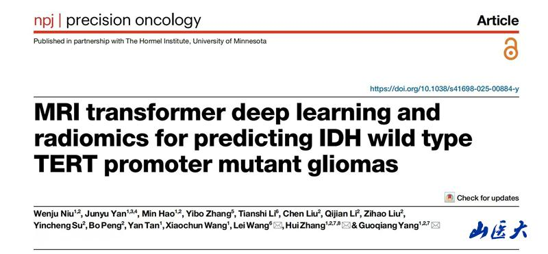 Recently, the research team led by Professor Zhang Hui from the School of Medical Imaging of our university published the latest research findings titled "MRI transformer deep learning and radiomics for predicting IDH wild type TERT promoter mutant gliomas" in npj Precision Oncology, a sub - journal of Nature. Niu Wenju, an undergraduate student majoring in medical imaging technology in the class of 2022 of the School of Medical Imaging, is the first author. Master students Yan Junyu, Hao Min, etc. are co - authors. Professor Zhang Hui, Associate Professor Yang Guoqiang, and Chief Physician Wang Lei from Beijing Tiantan Hospital affiliated with Capital Medical University serve as co - corresponding authors.