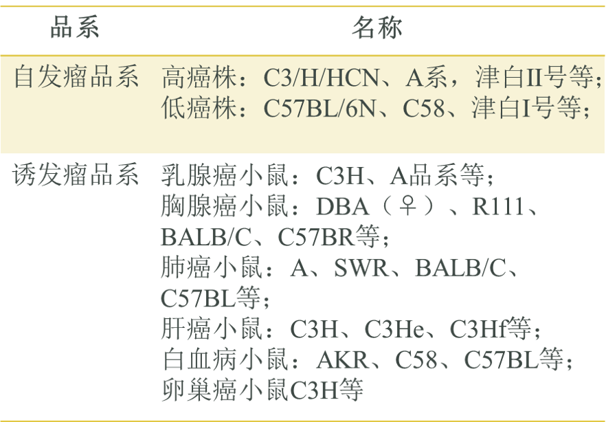 (2)以腫瘤研究需要培育的品系很多,如下表: