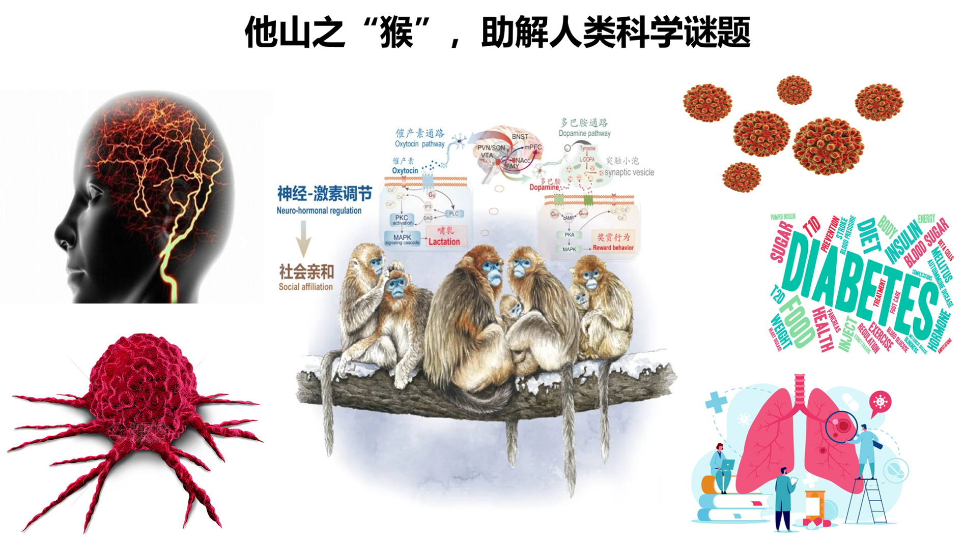 非人靈長類動物作為人的替身,在醫學研究中扮演著重要角色,它們幫助我們解開了許多科學難題。在闡明靈長類社會演化、神經退行性疾病、腫瘤、埃博拉等領域的疾病機理,預防診斷,藥物治療有效性和安全性方面都具有重大意義。