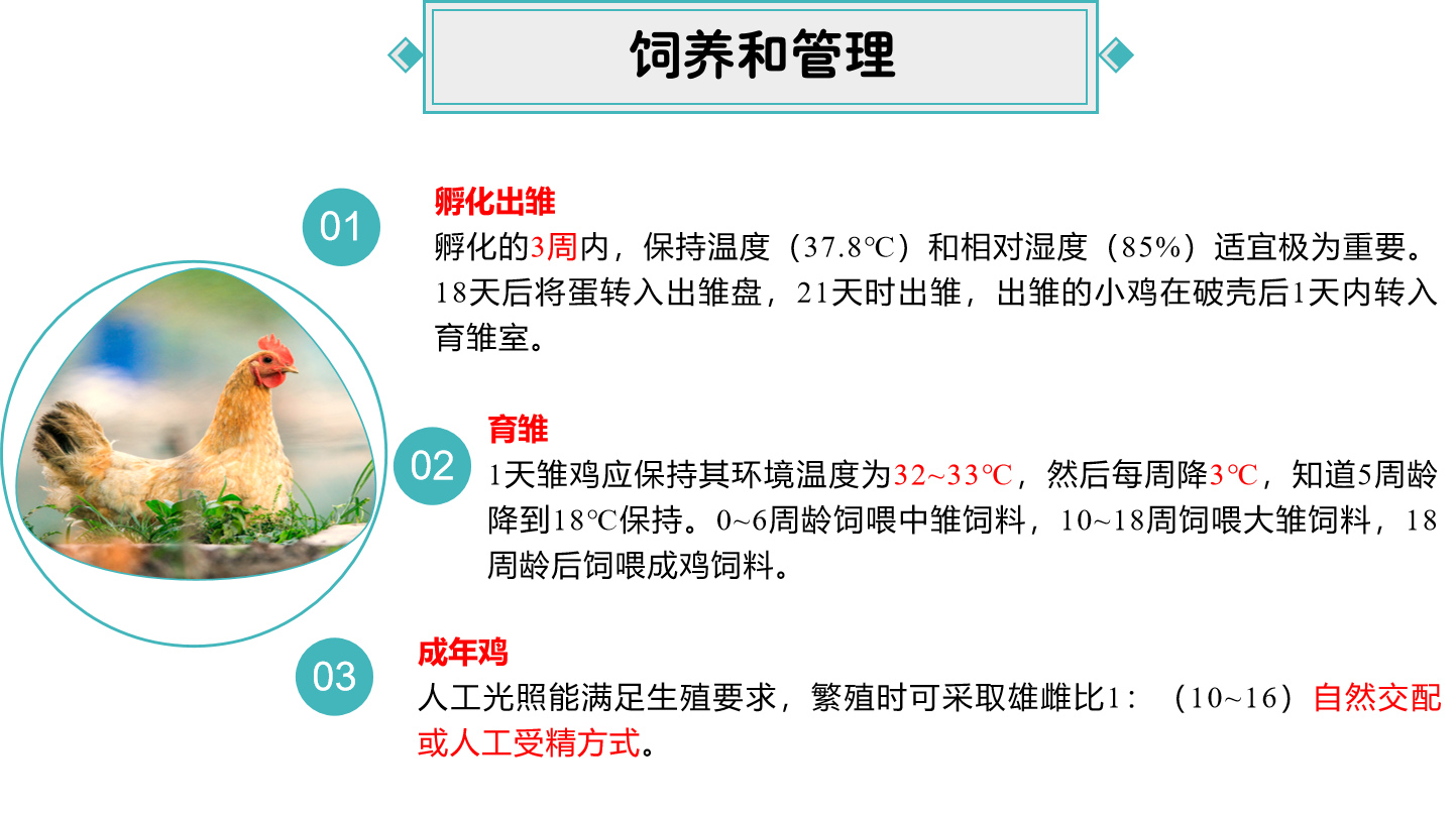 (4)雞屬于卵生動物,產蛋沒有季節性。根據雞的不同生長階段,分為雛雞、青年雞和成年雞,壽命平均7~8年,飼養環境下一般最長存活13年。
