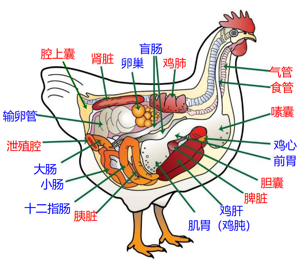 雞外形似鳥,分為頭部、頸部、體軀與翅膀、尾部和腿5部分,全身被覆黑、白、黃、褐等顏色的絨毛和羽毛。其解剖學特點和人相似,分為五大系統。