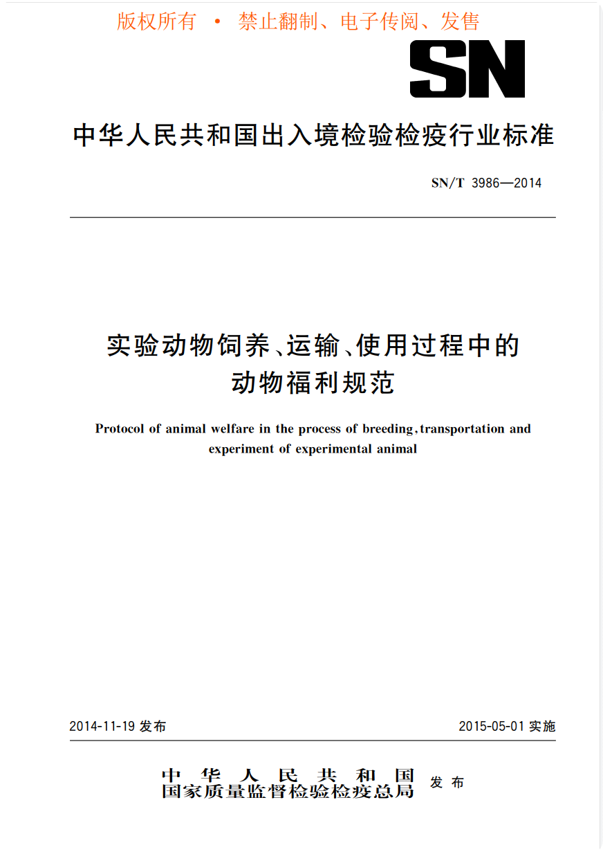 SN-T 3986-2014 實(shí)驗(yàn)動(dòng)物飼養(yǎng)、運(yùn)輸、使用過程中的動(dòng)物福利規(guī)范