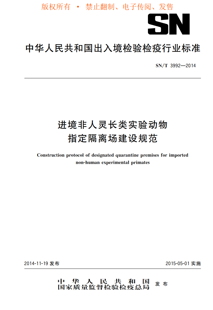 SN-T 3992-2014 進(jìn)境非人靈長(zhǎng)類實(shí)驗(yàn)動(dòng)物指定隔離場(chǎng)建設(shè)規(guī)范