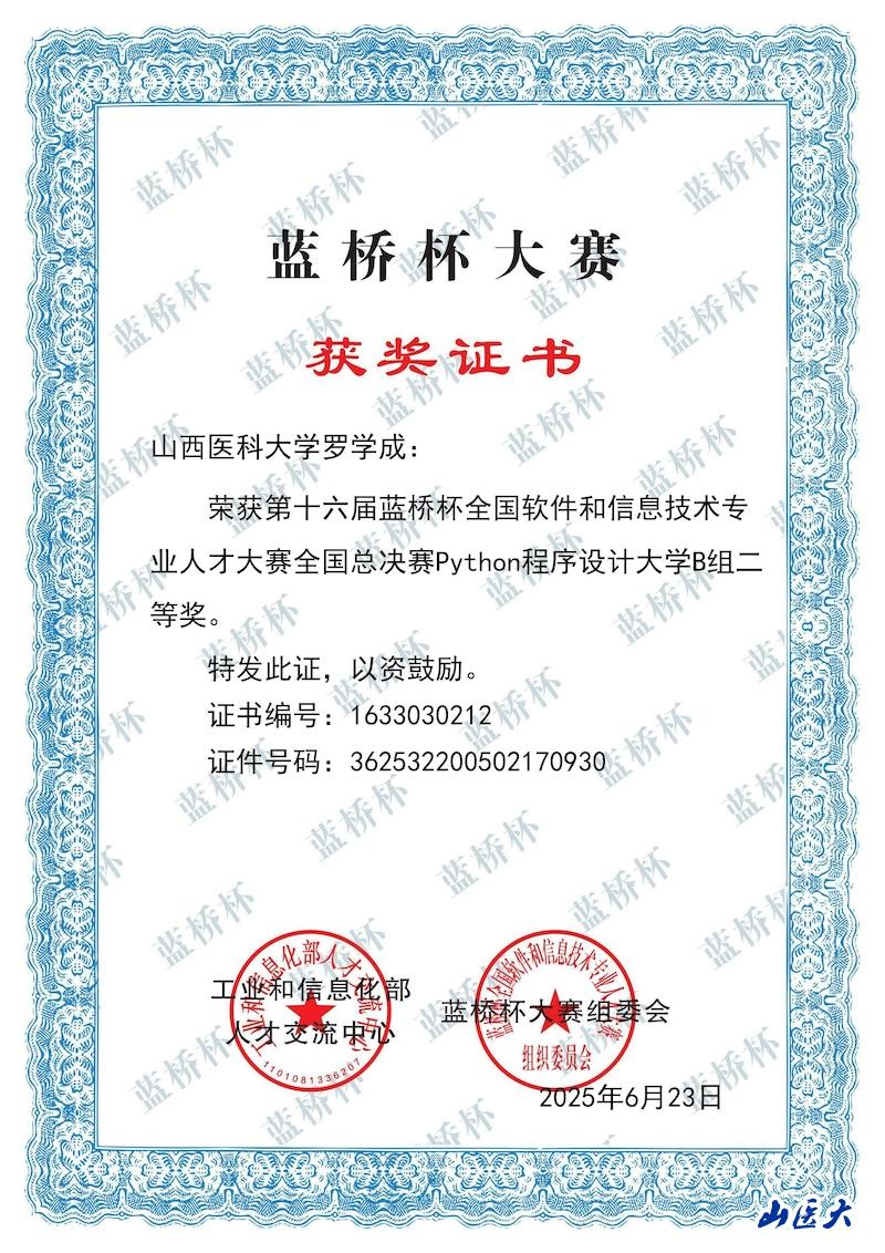 經過省賽和區域賽的激烈角逐,共有1200余名優秀選手進入全國總決賽。涵蓋算法設計、程序開發、嵌入式系統等多個技術方向,旨在全面考察選手的專業能力與創新實踐水平。羅學成同學選擇了Python B賽道,專注于算法設計競賽。比賽中面對復雜的編程挑戰,憑借扎實的基礎知識和出色的邏輯思維能力,最終斬獲全國二等獎。藍橋杯大賽由工業和信息化部人才交流中心主辦,是面向全國高校大學生的IT類學科競賽,連續多年入選中國高等教育學會《全國普通高校學科競賽排行榜》(2023年位列第27位),也是武書連本科高校學科競賽獲獎采集數據源。此次競賽展示了我校學子在信息技術領域的卓越實力。學校將進一步完善“以賽促學、以賽促建”的育人機制,通過在計算機、人工智能等相關賽事中的持續參與與深耕,力爭取得更加優異的成績。