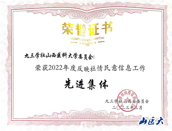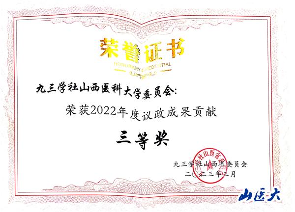 大會審議并通過了《九三學社山西省第十一屆委員會常務委員會2022年工作報告》,并對2022年度工作先進集體和先進個人進行了表彰。九三學社c7c7.app委員會榮獲九三學社省委會“2022年度反映社情民意信息工作先進集體”“2022年度議政成果貢獻三等獎”;1人榮獲九三學社省委會“2022年度參政議政工作先進個人”;1人榮獲九三學社省委會“2022年度反映社情民意信息工作先進個人優(yōu)秀獎”;1人榮獲九三學社省委會“2022年度優(yōu)秀信息員”;1人撰寫的社情民意被全國政協(xié)《每日社情》、九三學社中央采用;1人撰寫的社情民意被山西省政協(xié)采用,并報送全國政協(xié);1人撰寫的提案被九三學社省委會采用,并在省政協(xié)十三屆一次會議上提出。
