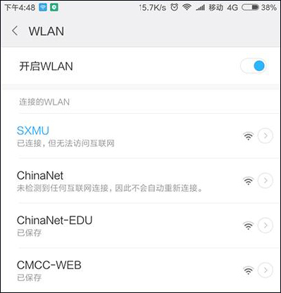 1、在無線覆蓋范圍內,打開手機的無線網絡設置,開啟WLAN,查找并連接“SXMU”的無線信號(見圖1)。