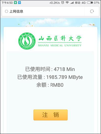 2、“SXMU”信號成功連接之后,手機會自動彈出登陸頁面(見圖2),輸入賬號和密碼(與老校區有線網絡登錄賬號和密碼相同)后點擊“登錄”,成功登錄后會顯示網絡使用信息(見圖3),表明無線連接成功。目前教職工可訪問校外互聯網,學生賬號只能訪問校內資源。