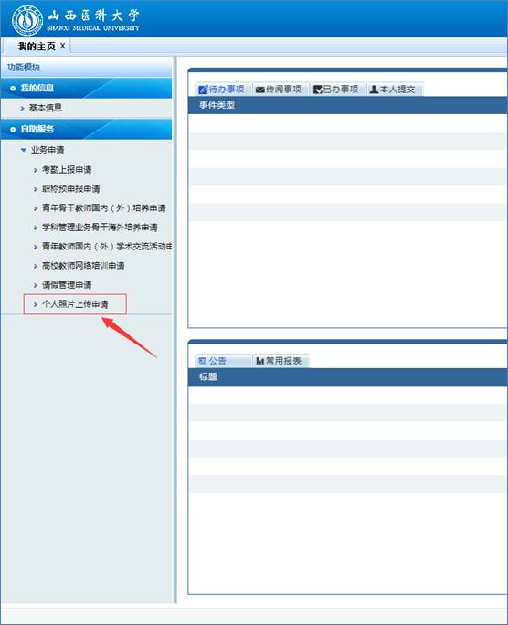 3、在左邊列表中選擇自助服務(wù)->業(yè)務(wù)申請(qǐng)->個(gè)人照片上傳申請(qǐng),如圖4。