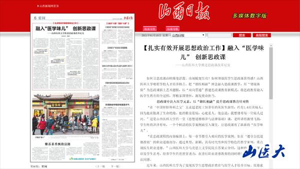 1月18日,《山西日報》第六版“要聞版”以《融入“醫學味兒” 創新思政課——c7c7.app推進思政課改革紀實》為題報道我校思政課改革的新成效。文章從“思政課中注入醫學元素,以‘德醫相融’提升思政課教育針對性”“為思政課插上藝術翅膀,以‘情境體驗’增強思政課教育親和力”“理論與實踐一體化教育,以‘雙向貫通’搭建思政課教育新模式”三個方面報道了我校思政課改革,全面闡述了我校思政課程的改革亮點。