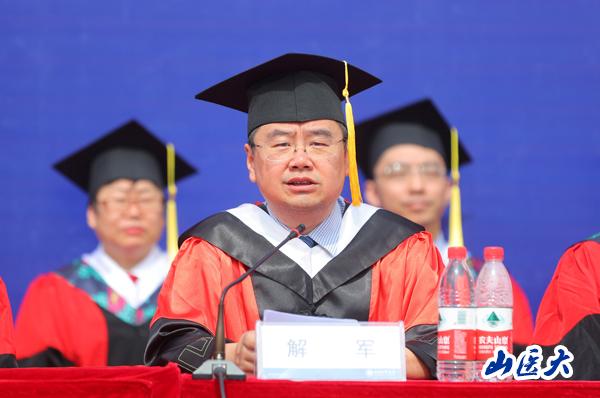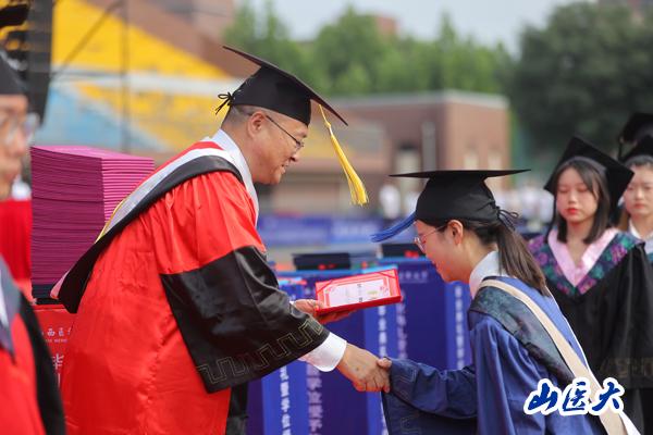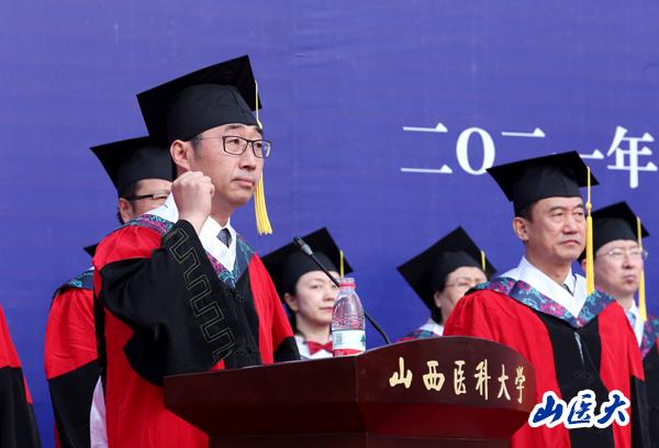 在熱烈的掌聲中,校長、校學位委員會主席李思進向畢業生致辭。他指出,生命本身是一種崇高的智慧。人類迄今為止,還沒完全弄清其中的奧妙。以研究生命為對象的醫學,同樣是一門需要極高智慧、終身學習的學問,是一門具有極強實踐性、人文性的學問。作為一名醫者,既要有仁心仁術,更要有大智慧。他以《不負時代,做有“智”山醫青年》為題,為畢業生提出了三點要求。一是要明辨是非,把穩思想之舵。在這百年醫學殿堂,不僅是學會治病救人的基本知識和技能,步入社會后能夠用所學救死扶傷,更重要的是,要學會獨立思考,有自己的思想,真正成為你自己。在面對五彩斑斕紛繁復雜的世界,能夠明辨是非、辨別善惡、認清真偽,不唯上、不盲從、不跟風;在無數的利益誘惑、大是大非面前,能夠把穩思想之舵,能夠堅守初心底線,挺得住、站得直、行得端。在任何時候,都要以國家、人民利益為重,做一名有智慧的山醫人。二是要終身學習,筑牢立身之本。要養成終生學習的習慣,不要稍有所得就沾沾自喜。通過不斷學習、實踐,筑牢立身之本,點亮智慧人生,才能更好地為患者服務,為社會服務,為國家服務。三是要奮力擔當,不愧青春之我。國家的前途,民族的命運,人民的幸福,是當代中國青年必須和必將承擔的重任。要積極投身第二個百年目標的實現,做親歷者和建設者,承擔重任,要將“個人夢”融入偉大的“國家夢”“民族夢”中,不負韶華、奮力擔當,在擔當中歷練,在盡責中成長,肩負起國家和民族的希望,書寫好新時代的青春篇章,實現好自己、家庭和國家的夢想。