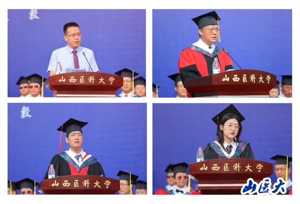 典禮上,山西省人民醫院腎內科專家李亞峰主任醫師作為校友代表致辭。博士生導師、國際法醫遺傳學專家嚴江偉教授作為教師代表進行了發言。2021屆研究生畢業生代表姚添同學和2021屆本科畢業生代表陳雪昭同學發表了畢業感言。