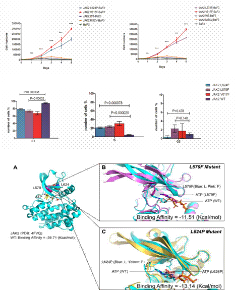 本研究我們通過選取L579F和L624P突變證實JAK2 外顯子13和15區(qū)域發(fā)生的突變能夠產生同JAK2V617F一樣的細胞增殖效應。晶體結構及蛋白分子動力學模擬顯示,L579F和L624P均可造成JAK2蛋白空間構象的改變,但此兩突變是通過干擾JAK2蛋白與其底物ATP的結合能力導致JH2蛋白結構域失去對JH1結構域的抑制效應;而JAK2V617F則是通過降低JH2結構域αC結構Tm值,改變其穩(wěn)定性,導致所在JH2區(qū)蛋白結構域失去對JH1結構域的抑制效應,進而誘發(fā)JAK2自主活化,產生自主促細胞增殖作用。該結果提示盡管JAK2 外顯子13和15區(qū)域發(fā)生的突變與JAK2V617F突變對JH2結構域產生不穩(wěn)定的機制略有不同,但最終效果均是引起JH2區(qū)蛋白結構域失去對JH1結構域的抑制效應。該研究已發(fā)表于International Jounal of Labrratory Hematology雜志。