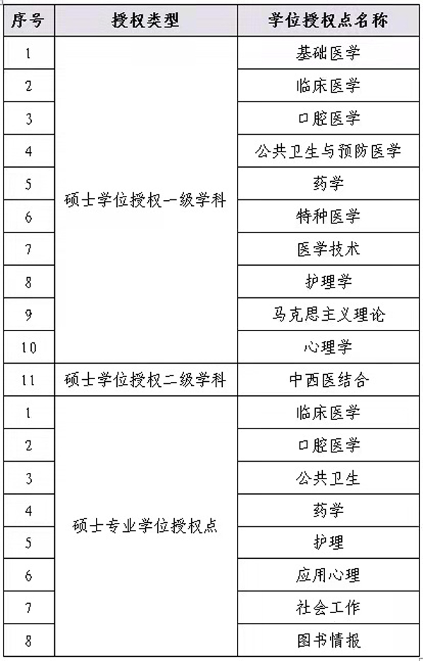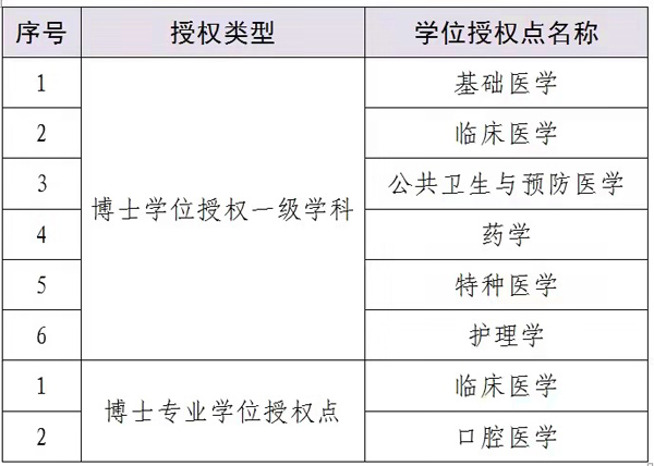 近年來,c7c7.app按照“以醫學為主,醫工結合、醫理結合、醫文結合、醫管結合,協調發展”的發展思路,不斷完善本碩博多層次的完整人才培養體系。本次新增博士學位授權點2個、碩士學位授權點3個,使博士研究生培養覆蓋了基礎醫學、臨床醫學、口腔醫學、護理學、公共衛生與預防醫學、藥學、特種醫學等醫學骨干學科門類,使碩士研究生培養從醫學骨干學科門類延伸至醫工結合(醫學技術)、醫理結合(心理學、應用心理)、醫文結合(馬克思主義理論)、醫管結合(社會工作、圖書情報)的學科門類,人才培養體系更加完善,人才培養能力進一步增強。