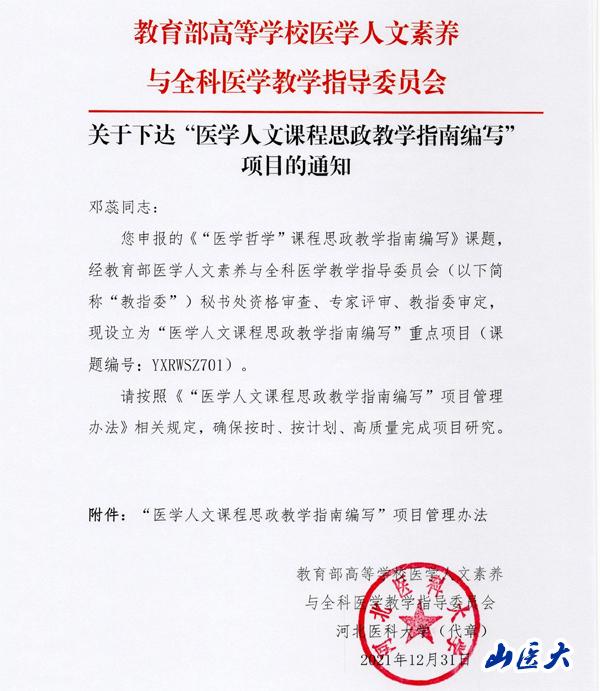 1月5日,教育部高等學校醫學人文素養與全科醫學教學指導委員會公布了“醫學人文課程思政教學指南編寫”項目名單,我校人文社會科學學院鄧蕊教授主持、醫學教育研究中心主任段志光教授等參與、聯合北京協和醫學院張新慶教授、南京醫科大學劉虹教授、河北醫科大學邊林教授等知名專家共同申報的《“醫學哲學”課程思政教學指南編寫》課題被設立為重點項目。這是我校首次在該類項目上獲批重點項目。