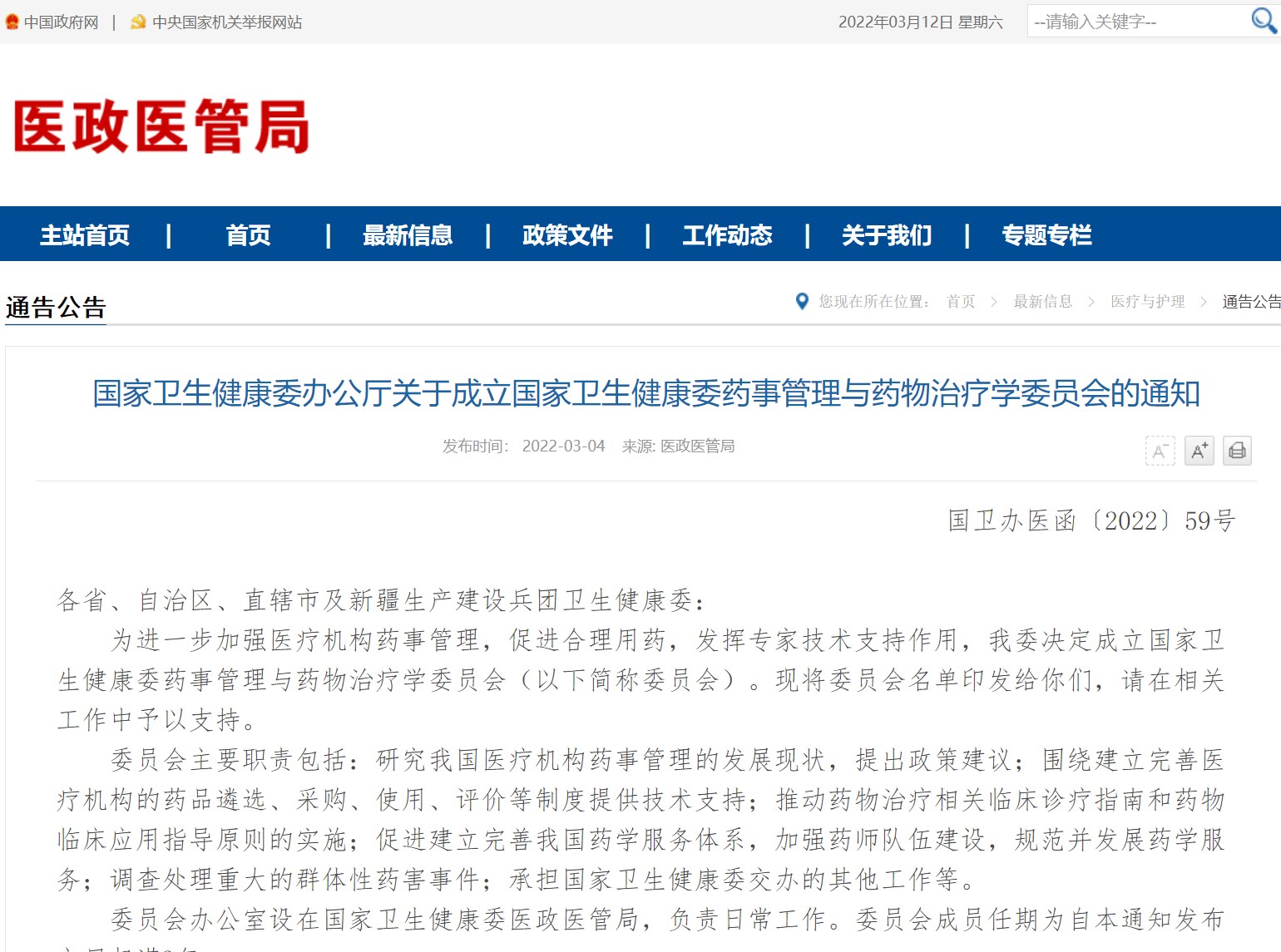新聞鏈接:國家衛生健康委辦公廳關于成立國家衛生健康委藥事管理與藥物治療學委員會的通知