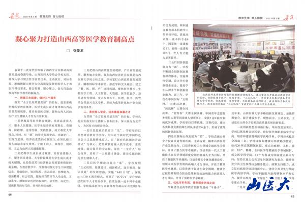 2022年3月,《前進(jìn)》雜志第355期“教育先鋒 育人楷模”欄目刊發(fā)校黨委書記張俊龍教授署名文章《凝心聚力打造山西高等醫(yī)學(xué)教育制高點(diǎn)》。