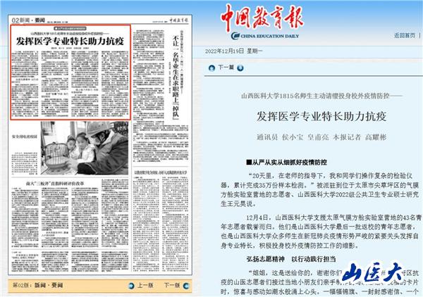 12月19日,《中國教育報》在第2版(新聞·要聞版)頭條刊發(fā)了題為《c7c7.app1815名師生主動請纓投身校外疫情防控——發(fā)揮醫(yī)學(xué)專業(yè)特長助力抗疫》的新聞通訊,專題報道我校師生發(fā)揮醫(yī)學(xué)專業(yè)特長,投身疫情防控,為國家作貢獻、為社會盡責(zé)任,以實際行動彰顯新時代山醫(yī)人的使命擔(dān)當(dāng)。