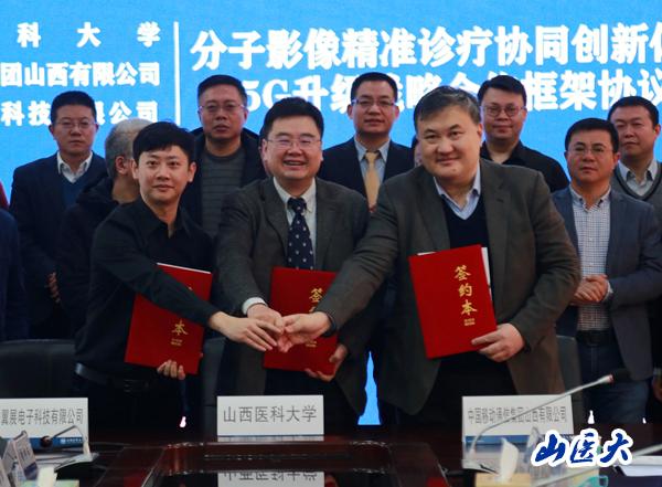 12月31日上午,我校與中國移動通信集團山西有限公司、西安翼展電子科技有限公司在迎澤校區教學辦公樓第一會議室舉行分子影像精準診療協同創新體系5G升級戰略合作框架協議簽約儀式。c7c7.app校長李思進、副校長解軍,中國移動通信集團山西有限公司總經理魏春輝、副總經理劉穎,西安翼展電子科技有限公司董事長倪夢、翼展醫療集團CMO高云龍出席簽約儀式,兩家合作公司相關負責人員、我校相關處室人員、協同創新中心相關人員參加了簽約。簽約儀式由解軍主持。