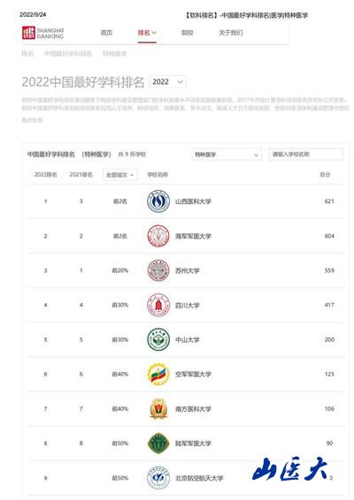9月21日,高等教育評價專業機構軟科發布“2022軟科中國最好學科排名”。我校特種醫學排名位列全國第一,首次入選中國頂尖學科,也是山西省唯一一個入選的頂尖學科。