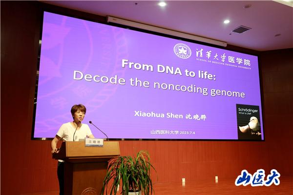 沈曉驊以《From DNA to Life: Decode the noncoding genome》為題,介紹了探索非編碼基因組影響轉(zhuǎn)錄和染色質(zhì)結(jié)構(gòu)的新模式,從獨特視角認(rèn)識發(fā)育和干細(xì)胞分化中細(xì)胞命運決定的普適性規(guī)律。包括揭示非編碼RNA順式調(diào)控鄰近轉(zhuǎn)錄和染色質(zhì)構(gòu)象;揭示基因組折疊的基層規(guī)律,提出轉(zhuǎn)座子重復(fù)序列(L1 和 B1/Alu)是染色質(zhì)三維大尺度結(jié)構(gòu)形成的遺傳分子基。籖NA結(jié)合蛋白通過相分離反饋調(diào)控轉(zhuǎn)錄和染色質(zhì)狀態(tài)。向燁以《病原微生物研究-從臨床到基礎(chǔ)分別》為題,分享了近年來人類重大病毒性傳染病的爆發(fā)及流行,介紹了其團(tuán)隊聚焦于病原微生物結(jié)構(gòu),致力于研究病毒入侵及組裝分子機(jī)制,并基于結(jié)構(gòu)開發(fā)生物藥物及疫苗。報告視野寬闊、內(nèi)容豐富、生動詳實、深入淺出,為我校師生奉獻(xiàn)了一場精彩紛呈的學(xué)術(shù)盛宴。