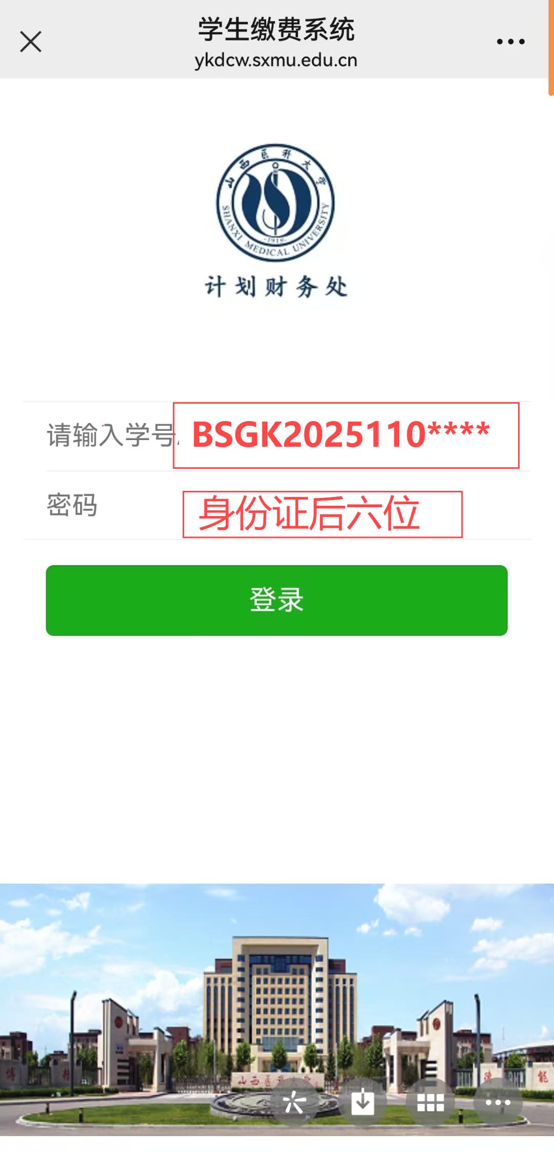 考生通過微信公眾平臺自助繳納報名費:1.搜索微信公眾號“c7c7.app計劃財務(wù)部”或掃描下方二維碼;2.點擊菜單,業(yè)務(wù)辦理→學(xué)生繳費,在學(xué)號處輸入“BSGK”+考生本人的報名號(例:BSGK2025110****,所有英文字母大寫,切記不要輸入姓名),初始密碼為身份證號后六位(X的英文字母大寫),登錄自助繳費系統(tǒng)(見圖例);3.點擊“我要繳費”,選擇繳費年度(2025),確認繳費信息,通過銀聯(lián)在線進行支付(任何有銀聯(lián)標志儲蓄卡均可)。