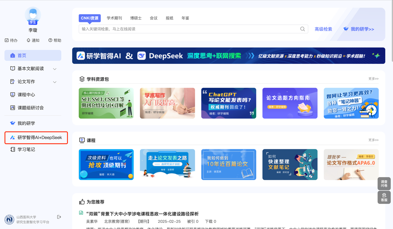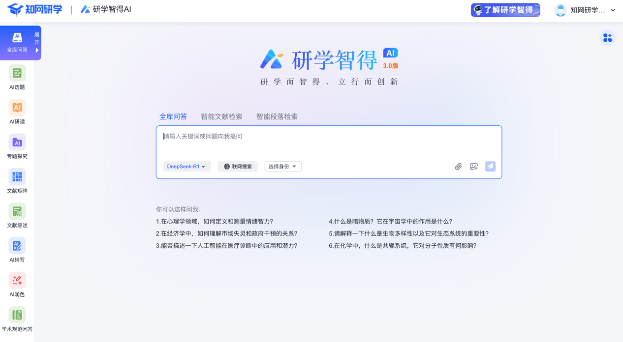 3. 功能體驗(yàn):進(jìn)入系統(tǒng)后,點(diǎn)擊左側(cè)導(dǎo)航欄【研學(xué)智得AI+DeepSeek】,即可開(kāi)啟智能科研服務(wù)。
