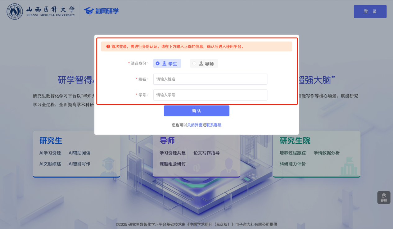 2. 身份認(rèn)證:點(diǎn)擊右上角【登錄】,注冊(cè)或使用個(gè)人賬號(hào)登錄,選擇“學(xué)生/導(dǎo)師”身份并填寫(xiě)姓名和學(xué)號(hào)。