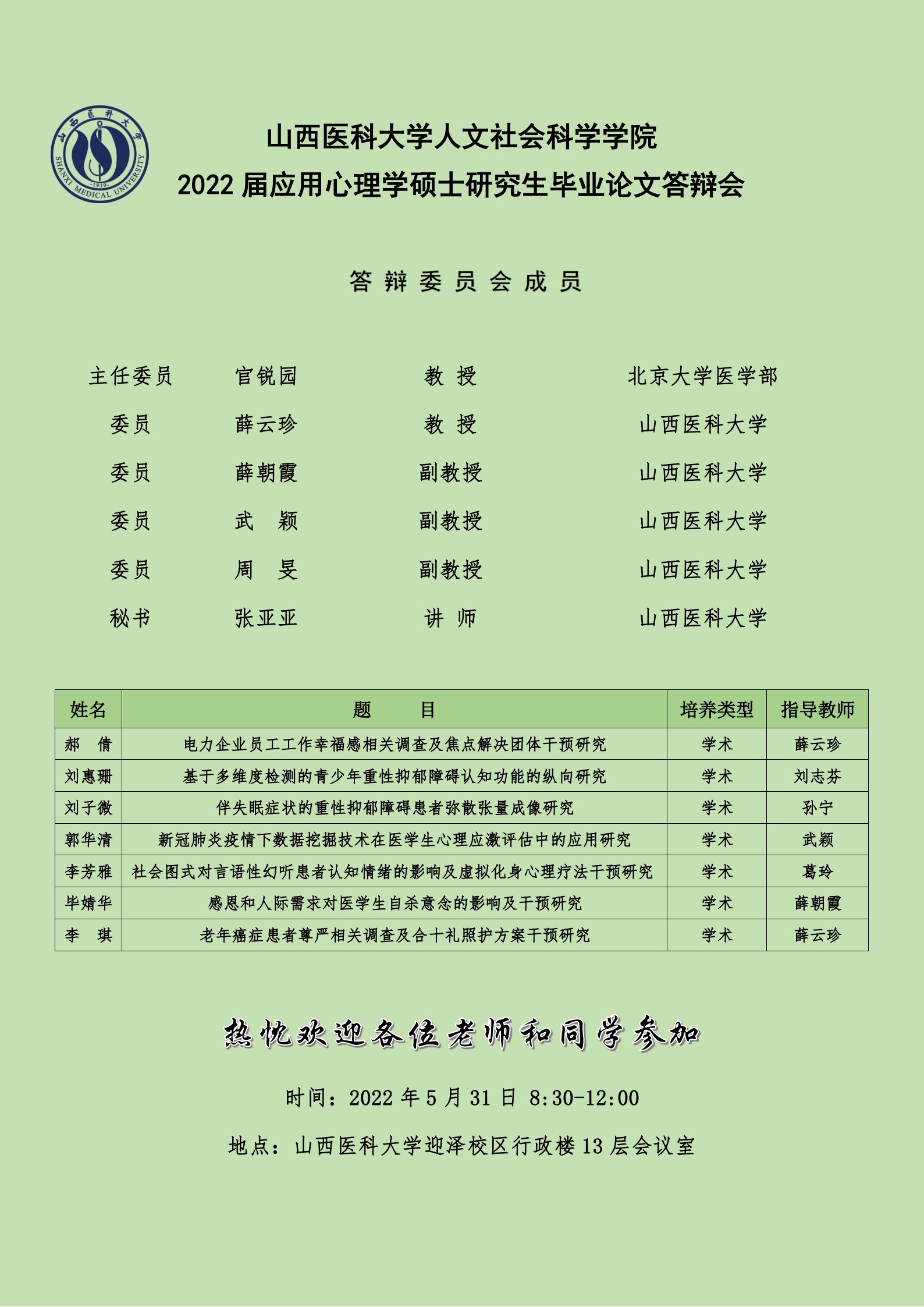 2022年c7c7.app人文社會(huì)科學(xué)學(xué)院應(yīng)用心理學(xué)碩士研究生學(xué)位論文答辯會(huì)通知