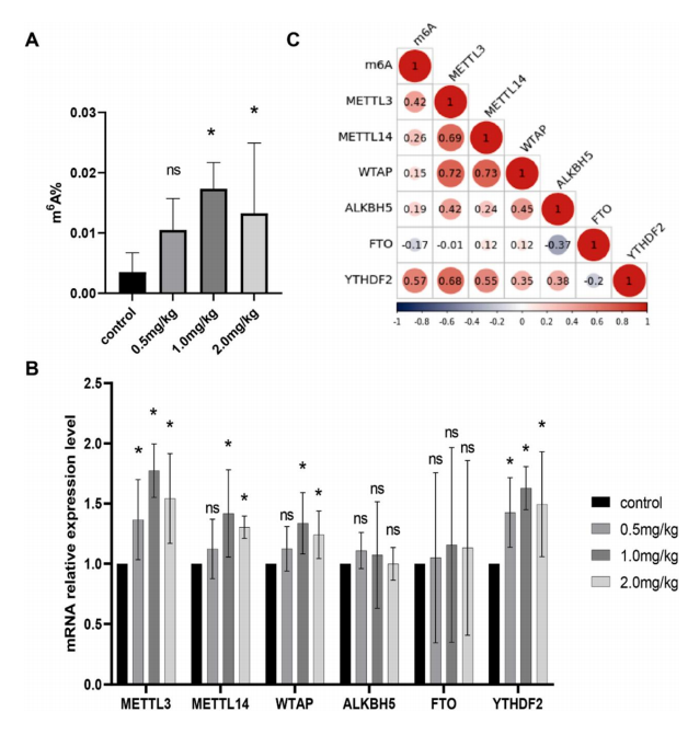 本研究采用皮下注射氯化鎘(0.5、1.0、2.0 mg/kg)的 方法構建了大鼠腎損傷模型。測定 m 6A 總體水平和 m 6A 修飾酶(METTL3、METTL14、WTAP、ALKBH5、FTO)的相對表達水平, 結果顯示 1.0 mg/kg 和 2.0mg/kg 處理組總 m 6A 水平顯著高于 對照組,且與對照組相比,各暴露組的 METTL3、METTL14、WTAP 和 YTHDF2 均顯著上調(P > 0.05),見圖 2。