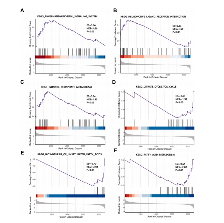 隨后,對測序數據進行 GO 和 KEGG 分析,結果顯示,在Cd 誘導的腎損傷中,m 6A 修飾位點上調的基因可能調節炎癥反應,如 IL-17、NOD 受體和 Notch 信號通路等炎癥相關通路。且利用基因集富集分析(GSEA)分析了測序基因的功能富集途徑,結果發現下調表達基因與脂肪酸代謝和不飽和脂肪酸的生 物合成有關。提示炎癥、脂肪代謝相關通路可能參與Cd 誘導腎損傷過程,見圖 4、圖 5。
