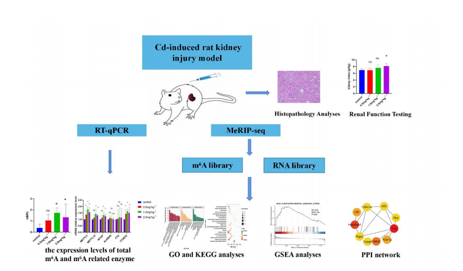 該研究基于人群研究發現的重金屬鎘(Cd)暴露致腎功能 損傷的基。私沂撅傭隕鱸嗟畝咀饔沒,構建了鎘致腎 損傷大鼠模型,通過高通量測序及生物信息學分析,揭示了鎘 致大鼠腎損傷中 N6-甲基腺苷(m 6A)的修飾圖譜及該過程中可能涉及的通路和基因,認為 m 6A 修飾可能通過調控炎癥和代謝 相關通路參與氯化鎘誘導腎損傷過程,從 m 6A 修飾角度為鎘致 腎損傷機制研究提供了新的思路。
