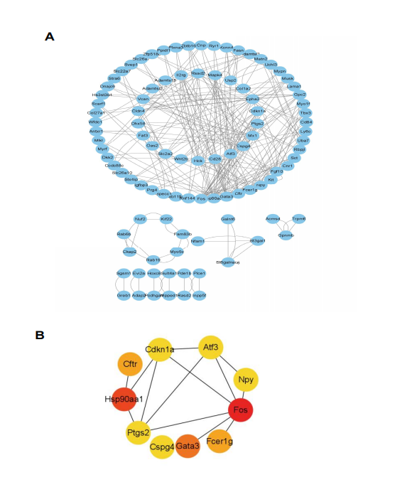 此外,還構建了蛋白-蛋白相互作用(PPI)網絡并選擇了 10 個關鍵基因(Fos, Hsp90aa1, Gata3, Fcer1g, Cftr, Cspg4, Atf3, Cdkn1a, Ptgs2 和 Npy),為進一步研究鎘致腎損傷可能 機制提供新思路,見圖 6。