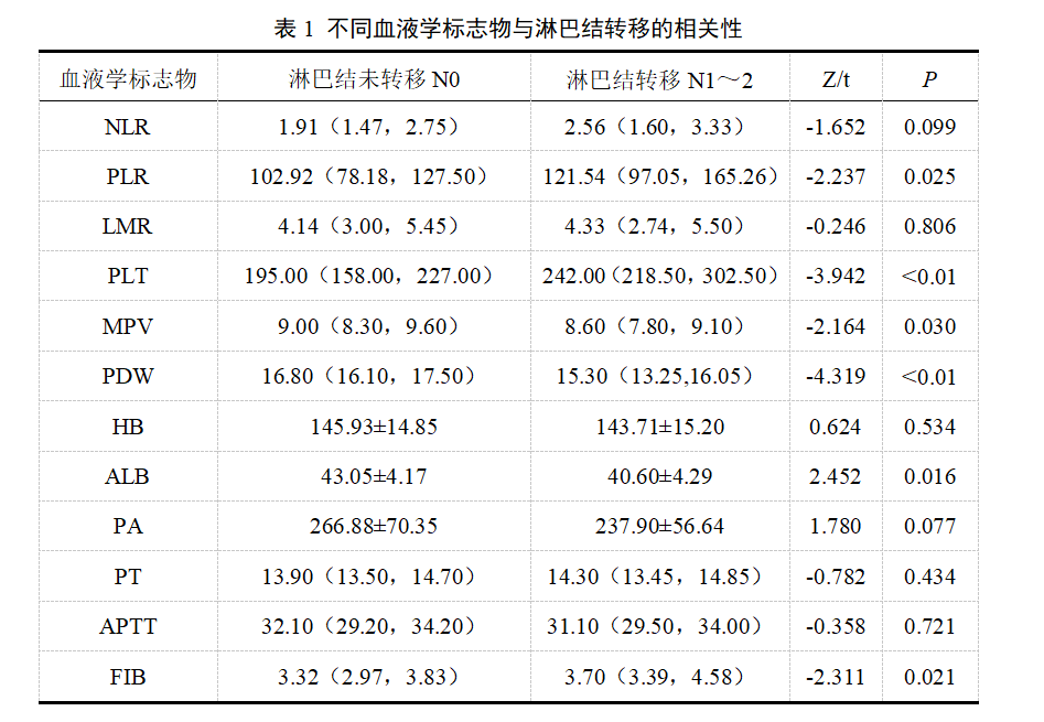 2. 不同血液學(xué)標(biāo)志物與淋巴結(jié)轉(zhuǎn)移的相關(guān)性