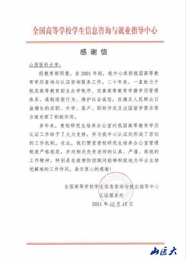 日前,我校研究生學院收到來自全國高等學校學生信息咨詢與就業指導中心的感謝函。信函對研究生學院在高等教育學歷認證工作中給予的支持表示衷心感謝。