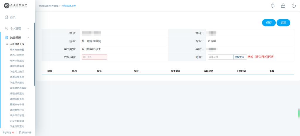 第四步:點擊“研究生教務”后進入學生端教務系統,進入系統后,須按提示操作注冊學籍,完善個人信息,然后點擊培養管理—六級成績上傳,在該界面下如實填寫六級成績,然后通過附件上傳六級證掃描件,具體要求如下:(1)請提交六級成績大于390分(含390分)的最高一次成績,低于390分者無需提交;(2)如六級證原件丟失,可提交原學校教務處出具的有效證明和國家四、六級考試中心出具的成績證明等;(3)如原學校暫未下發六級成績單,請提供成績查詢的截屏或帶二維碼的電子成績單,如下圖: