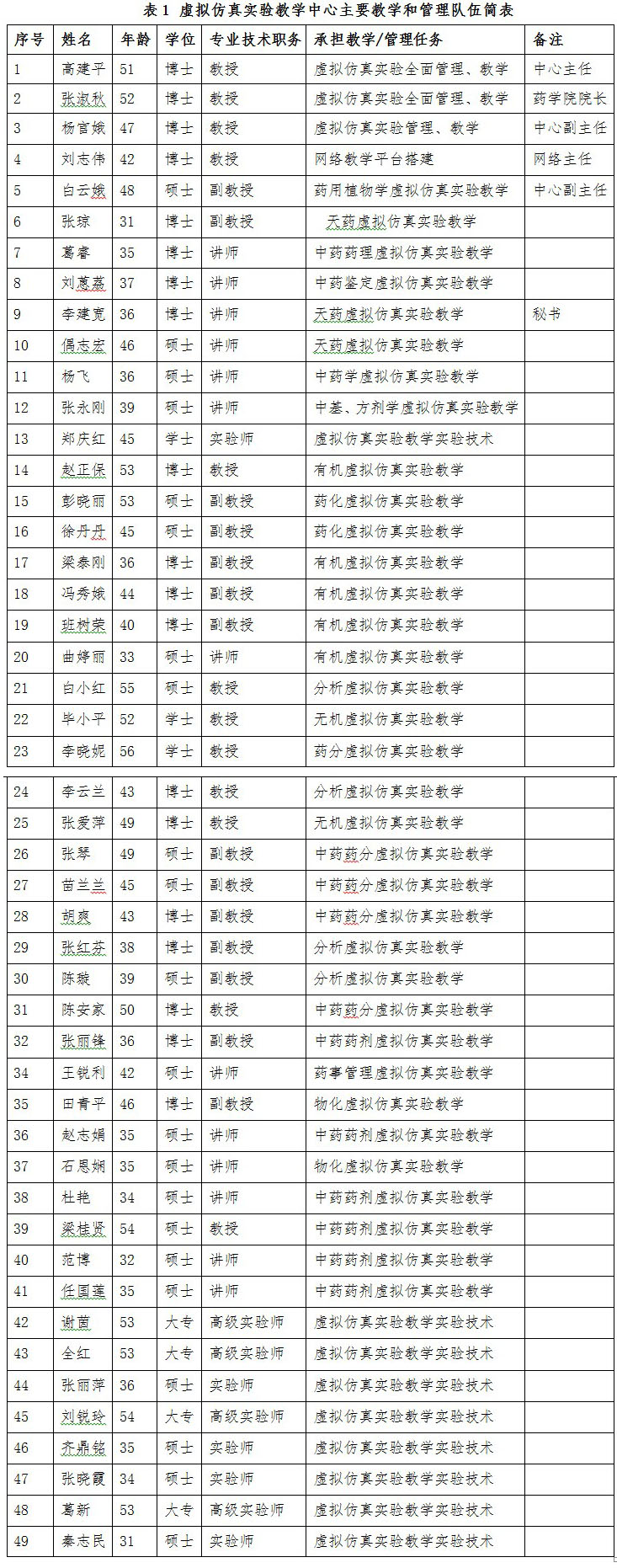 本實驗中心依托中藥學一級學科,整合藥學院及中藥標本館資源,具有一支年齡、學源、學歷等方面合理協調的教學建設、運行維護的專職隊伍: