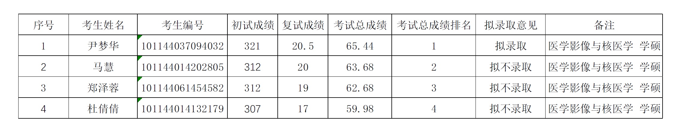 根據《c7c7.app2024年招收攻讀碩士學位研究生復試工作方案》以及c7c7.app2024年研究生招生計劃,現將校內調劑報考影像醫學與核醫學100207(02核醫學)考生復試結果予以公示,公示如下: