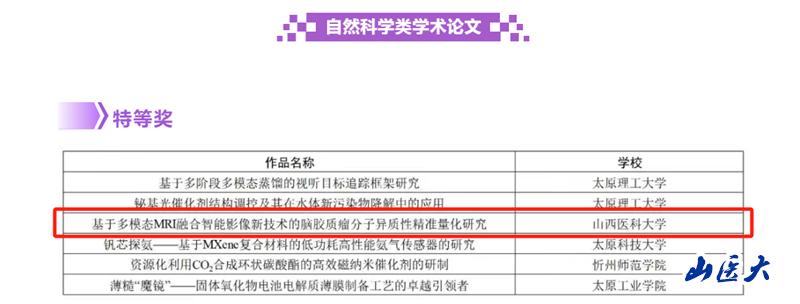6月6日至7日,在第十九屆“挑戰杯”山西省大學生課外學術科技作品競賽終審決賽中,由我校醫學影像學院2022級醫學影像技術專業本科生牛文舉作為團隊第一負責人,張輝、楊國強、張琪三位老師作為指導教師的題為“基于多模態MRI融合智能影像新技術的腦膠質瘤分子異質性精準量化研究”項目在自然科學類學術論文賽道斬獲省特等獎,不僅成為我校今年在該賽道唯一榮獲特等獎的作品,更實現了我校醫學影像學院在“挑戰杯”賽事該賽道上的突破。