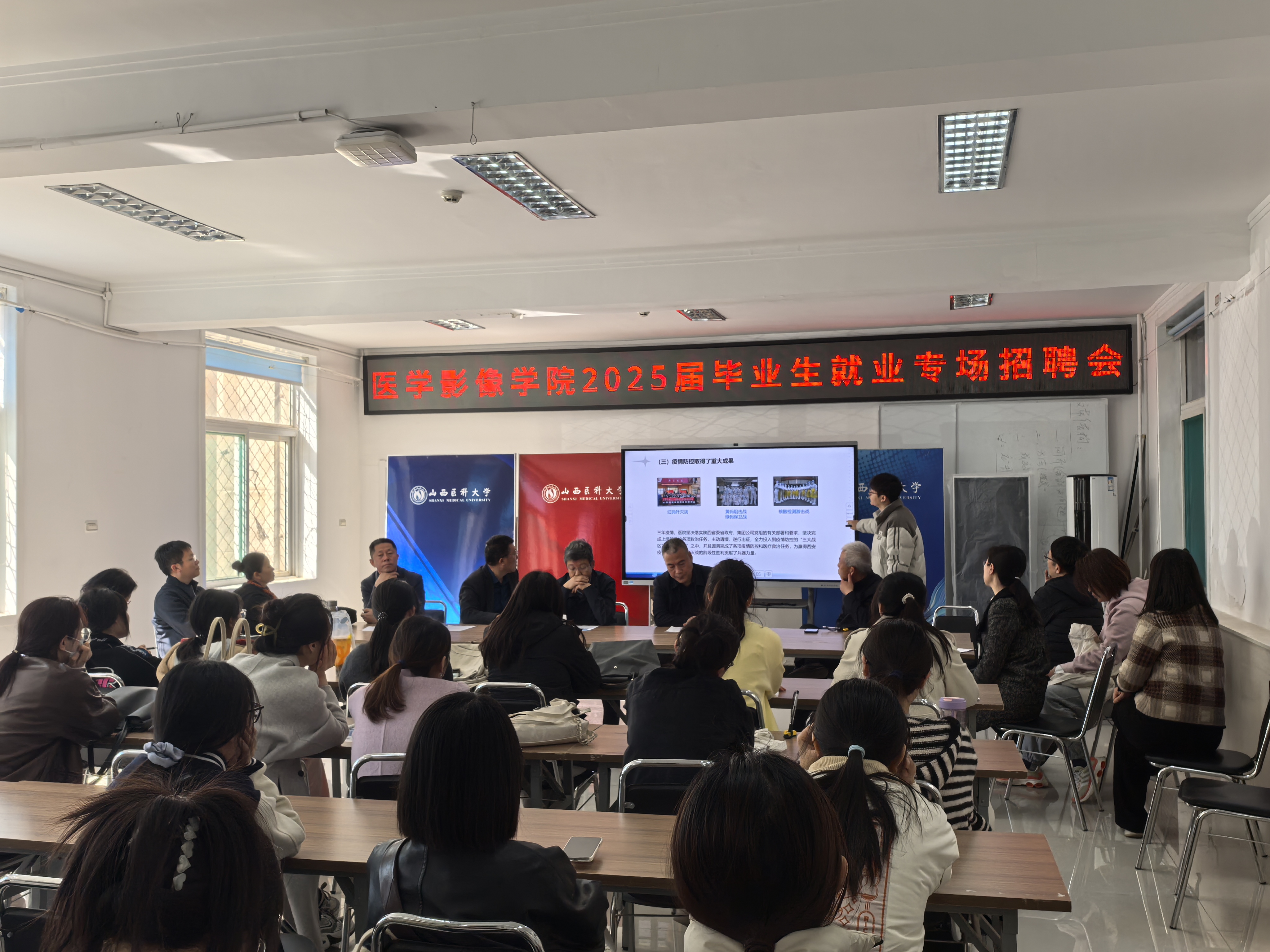 招聘會上,郭曄首先對四家招聘單位的到來表示熱烈的歡迎和誠摯的謝意。她介紹了學院的基本情況,并對2025屆畢業生教育培養情況進行了全面的總結。隨后的招聘單位宣介環節,西安兵器工業總醫院、汾陽醫院、陽泉市第一醫院、呂梁市人民醫院分別就各自單位的醫院的建設情況、影像科基本情況以及人才需求做了介紹。