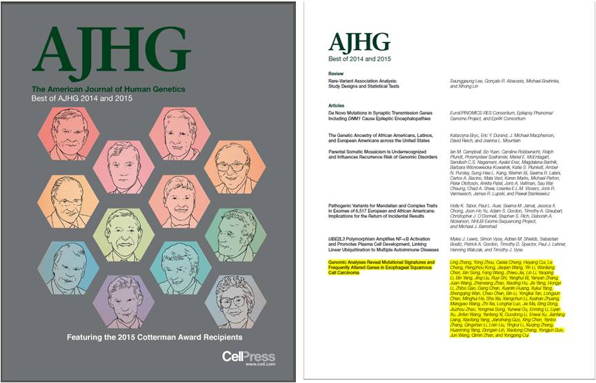 近日,我中心崔永萍教授團隊發表在《細胞》(cell)子刊《美國人類遺傳學雜志》(Am J Hum Genet,影響因子10.987)上的研究論文《食管鱗癌全基因組分析揭示其突變頻譜及高頻顯著突變基因》獲得該雜志2014—2015年度“十佳論文”。此次共有6篇研究型論文入。抻榔冀淌詰穆畚奈渲兄。本次評選范圍為2014年7月至2015年6月期間發表在該雜志的全部論文。