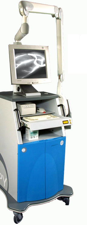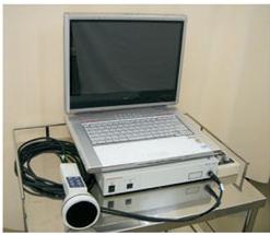 如圖4:整個系統被放置在一臺移動車上,由 ⑴激發光/攝像機, 攝像機是30幀頻/秒的CCD;⑵顯示器,遠端控制中心;⑶中央處理系統;(⑷激光發生器,激光發生器的輸出功率是2.0 W,攝像機和激光輸出伴行,激光在心臟的照射面積是56 cm2 (7.5 cm×7.5 cm) 開發手術時鏡頭距心臟30 厘米。